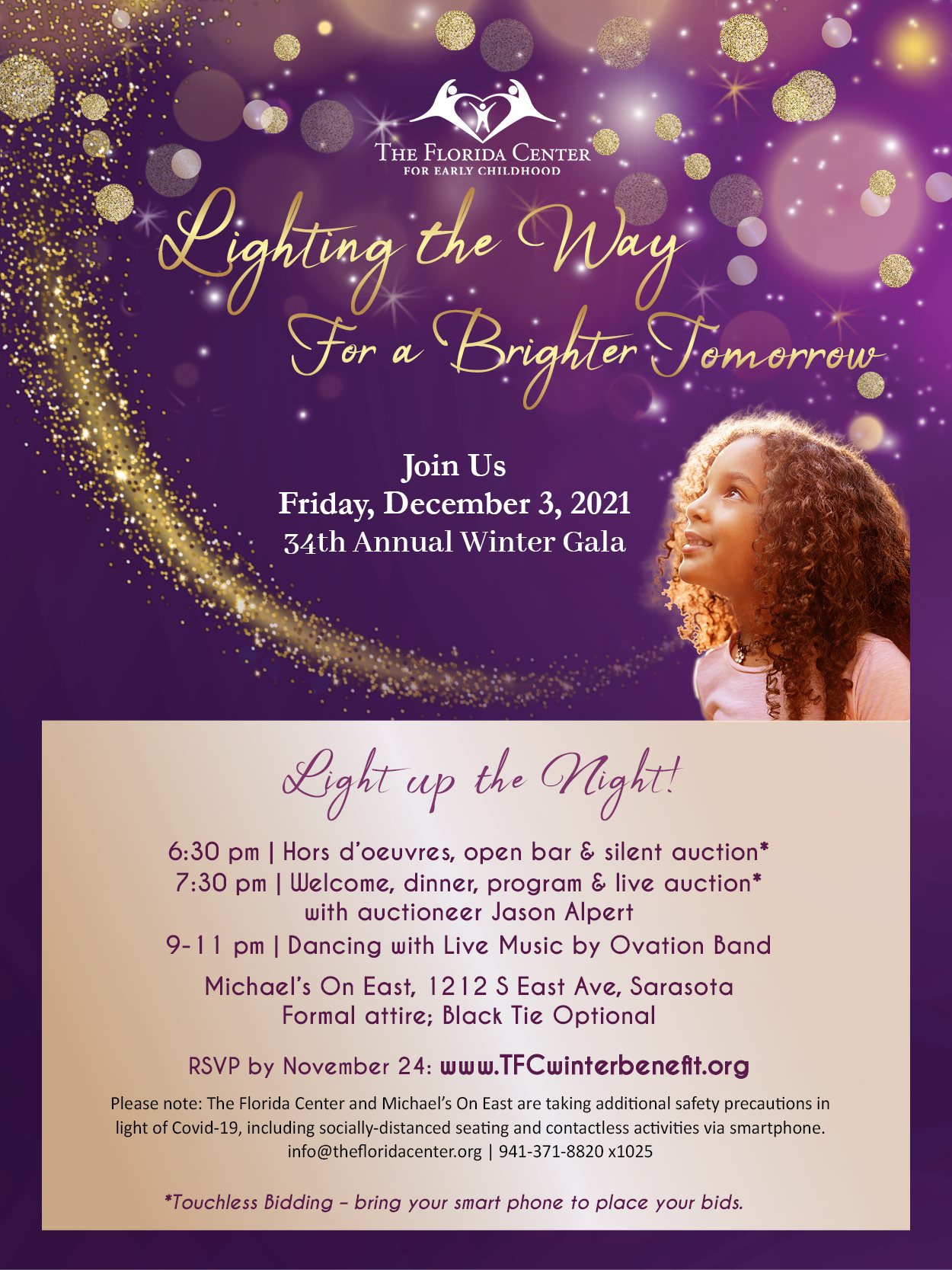 Join us in providing local children with a “brighter tomorrow” by supporting the annual benefit for The Florida Center for Early Childhood. The Winter Gala: Lighting the Way… will begin at 6:30 p.m. on Friday, December 3, at Michael’s On East or virtually. This event will be our 34th annual fundraiser; all proceeds benefit young children and their families. Guests will enjoy dinner, drinks, and entertainment by the talented band Ovation – all for a very worthy cause.